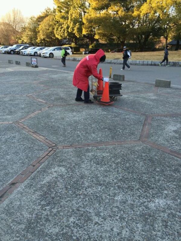 試合終了後、場外の規制用にカラーコーンを並べています。
